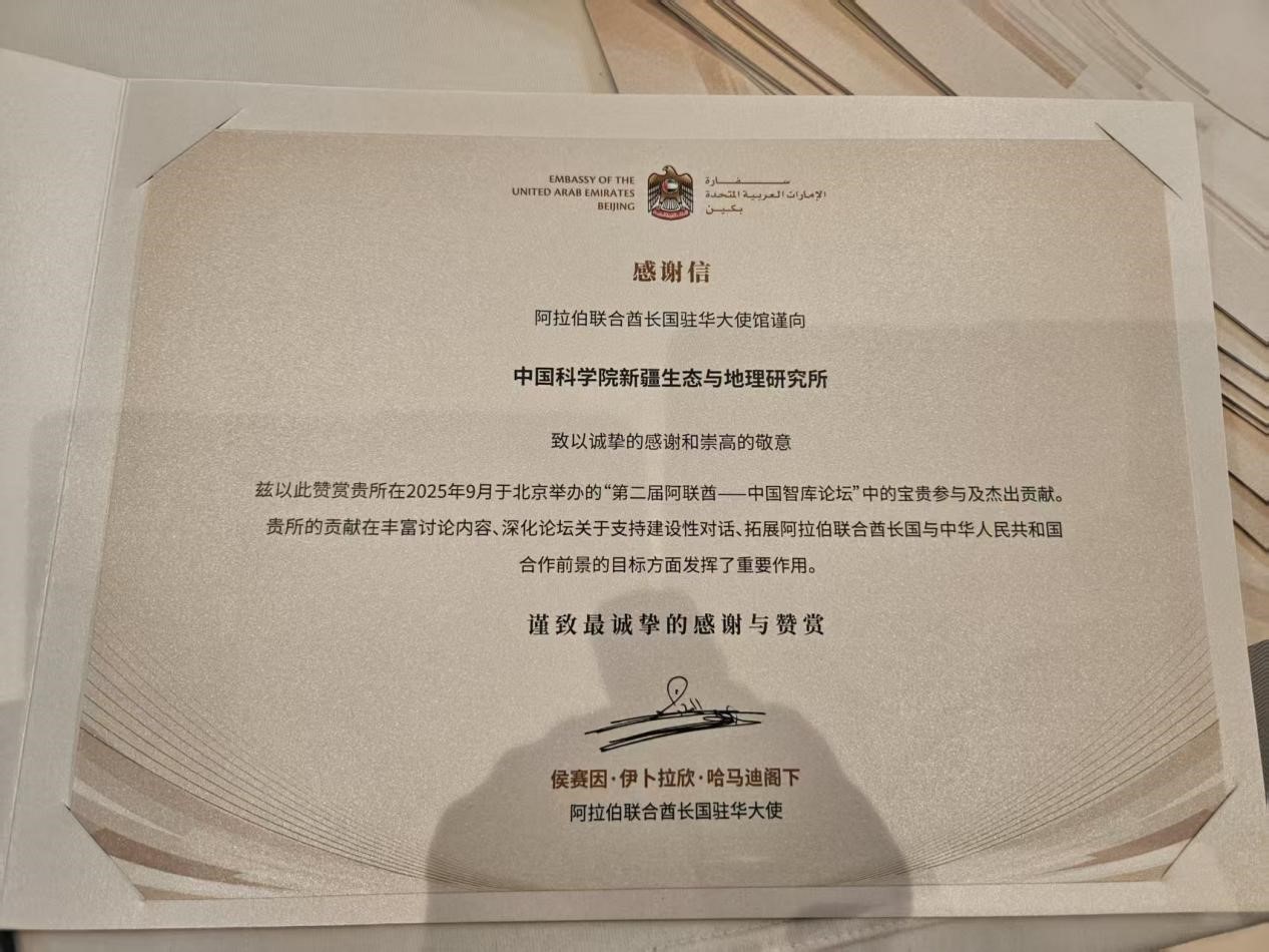 ????9月23日,由阿联酋驻华大使馆主办的第二届阿联酋—中国智库论坛在北京开幕。阿中双方多位专家出席,并就各类议题发表演讲。中国科学院新疆生态与地理研究所雷加强研究员及团队应邀参会,并与阿中双方高级别代表及专家学者进行深入交流。
